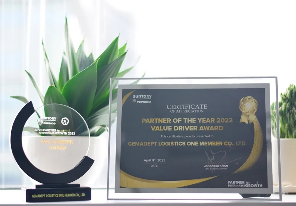On April 11, 2023, CJ Gemadept Logistics was honored with the Value Driver Award – Partner of the Year at the "Sustainable Development Partners" conference organized by Suntory Pepsico Viet Nam (SPVB). This award recognizes the company's relentless efforts throughout the collaboration and service provision to SPVB in the Mekong Delta and Central Vietnam regions.