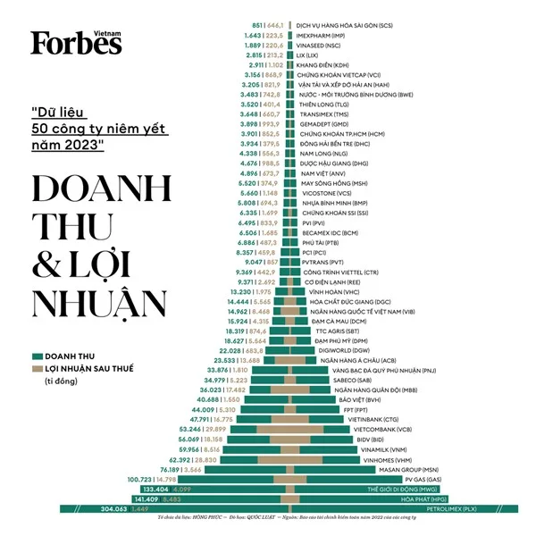 Companies listed on the HSX and HNX are evaluated through several stages to create the List of Top 50 Listed Companies in 2023. In the qualifying round, companies must meet the following conditions: profitable in 2022, has a turnover and capital of at least VND 500 billion. In the next round, companies are evaluated quantitatively based on 5 criteria: revenue, profit, ROE ratio, ROC, and the compound growth rate of EPS growth in the period of 2018 – 2022 with the support of quantitative calculations by SSI Securities. Forbes Vietnam then conducts a qualitative study to evaluate the company's sustainable development including the company's position in the industry, profit sources, quality of corporate governance, industry prospects, etc.