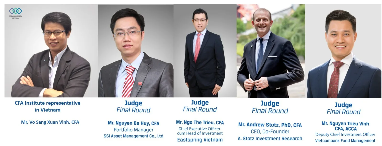 Dù được đánh giá rất cao về năng lực chuyên môn cũng như kỹ năng thuyết trình nhưng phía trước những sinh viên ưu tú đến từ 4 đội thi xuất sắc nhất vẫn là những thử thách cam go, không chỉ là sự cạnh tranh giữa những nhân tài với nhau mà còn là những tiêu chuẩn, yêu cầu rất khắt khe từ Ban giám khảo là những chuyên gia tài chính danh tiếng đến từ những tổ chức tài chính hàng đầu tại Việt Nam và quốc tế, bao gồm: Tiến sĩ Andrew Stotz, CFA – Giám đốc điều hành, Đồng sáng lập của A. Stotz Investment Research; Ông Ngô Thế Triệu, CFA, CEO và Tổng Giám Đốc Đầu tư Công ty Eastspring Vietnam; Ông Nguyễn Bá Huy, CFA – Giám đốc Quản lý Danh mục Đầu tư Công ty TNHH Quản lý Tài sản SSI; Ông Nguyễn Triệu Vinh, CFA, ACCA, Phó Tổng Giám đốc Đầu tư, Công ty Quản lý Quỹ Vietcombank.