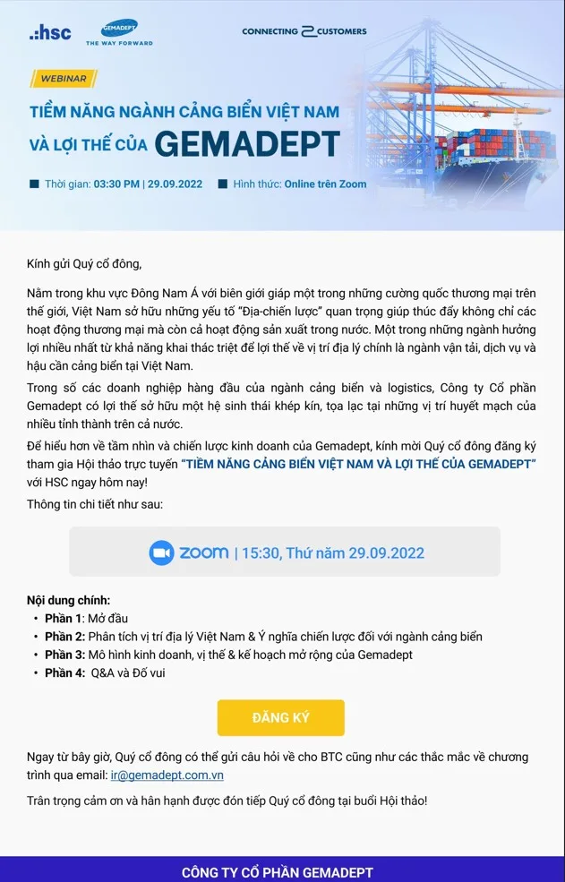 HSC và Gemadept phối hợp tổ chức Webinar: Tiềm năng ngành Cảng biển Việt Nam và lợi thế của Gemadept
